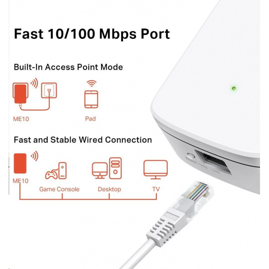 Nástěnný extender signálu ME10 slouží k rozšíření pokrytí Wi-Fi sítě a posílení signálu existující hostitelské sítě. S rychlostmi připojení až 300 Mbit/s můžete Wi-Fi síť každý den používat k hraní on-line her, stahování velkých souborů a sledování filmů na libovolném místě v domě.