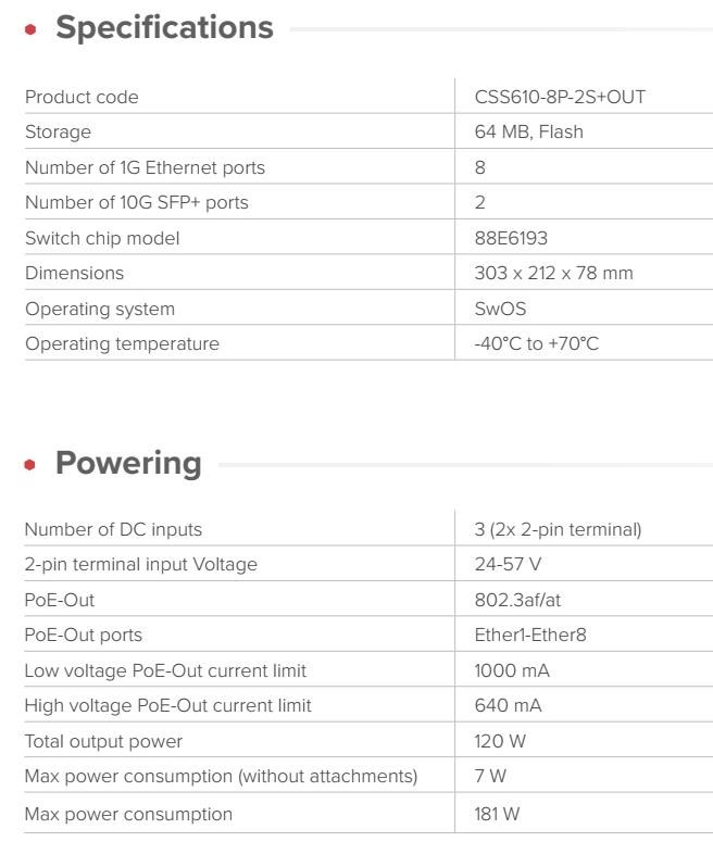 Kompaktní PoE switch s integrovanou UPS a inteligentní nabíječkou baterií – garance bezvýpadkového provozu CCTV kamer a přístupových bodů při výpadích napájení. Výpadky proudu by neměly znamenat prostoje. NetPower Lite 8P poskytuje spolehlivé napájení přes Ethernet i v případě výpadku elektrické sítě. Integrovaná UPS a inteligentní nabíječka spolupracují s vaší externí 24V baterií a mohou poskytovat vysokonapěťový výstup PoE i z nízkonapěťových zdrojů stejnosměrného proudu. netPower je tak ideální volbou pro CCTV, kanceláře, bytové domy a instalace v rámci inteligentních měst. NetPower Lite 8P je vybaven osmi gigabitovými ethernetovými porty s výstupem PoE 802.3af/at a dvěma 10G SFP+ uplinky pro vysokorychlostní backhaul. Používá systém SwOS Lite – rychlý, efektivní a příjemně jednoduchý na správu. SwOS je konfiguratelné z webového prohlížeče, vedle bežných funkcí řiditelných switchů umožňuje například • port-to-port forwarding management • apply MAC filter • configure VLANs • mirror traffic • apply bandwidth limitation • adjust some MAC and IP header fields Napájení je flexibilní, stačí připojit 24–57 V DC do 2-pinového terminálu. Stejně jako naše ostatní zařízení vhodná pro venkovní použití je i tento přepínač konstruován tak, aby vydržel. S provozním rozsahem od –40 °C do +70 °C funguje netPower Lite 8P i tam, kde by mnoho jiných zařízení již selhalo. Přepínač může odebírat až 181 W celkem, s rozpočtem 120 W PoE-Out. Pokud je příchozí výkon omezen, PoE je automaticky upřednostněno – nejprve se zpomalí nabíjení, aby vaše základní zařízení zůstala online. Integrovaná podpora UPS je efektivní, spolehlivá, nabízí různé možnosti : Připojte baterii s nominálním napětím 24 V – obvykle dvě 12V jednotky zapojené do série – a přepínač se okamžitě stane malým, efektivním UPS. Během výpadku napájení zůstávají zařízení PoE online bez jakýchkoli přerušení. Nabíječka podporuje zaplavené, AGM a gelové olověné baterie, stejně jako LiFePO4 (lithium-železo-fosfátové baterie) s příslušným BMS. Subsystém nabíječky je navržen pro nabíjení baterií přes 2pinový konektor v proudovém rozsahu 0,2–1,6 A a napěťovém rozsahu 20–31,7 V. Součástí je teplotní senzor, který jemně ladí napětí pro olověné baterie a blokuje nabíjení, když teploty překročí bezpečný rozsah. To pomáhá prodloužit životnost baterie. Podrobné technické specifikace: Product code: CSS610-8P-2S+OUT Storage: 64 MB, Flash Number of 1G Ethernet ports: 8 Number of 10G SFP+ ports: 2 Switch chip model: 88E6193 Dimensions: 303 x 212 x 78 mm Operating system: SwOS Operating temperature: -40°C to +70°C Napájení: Number of DC inputs: 3 (2x 2-pin terminal) 2-pin terminal input Voltage: 24-57 V PoE-Out: 802.3af/at PoE-Out ports: Ether1-Ether8 Low voltage PoE-Out current limit: 1000 mA High voltage PoE-Out current limit: 640 mA Total output power: 120 W Max power consumption (without attachments): 7 W Max power consumption: 181 W Upozornění: Výrobce MIKROTIK nevztahuje záruku na zařízení poškozená přepětím. Zařízení je třeba na vstupech adekvátně chránit proti indukovanému elektrostatickému přepětí či přepěťovým špičkám na silovém vedení. Při venkovních instalacích je třeba používat stíněnou kabeláž (FTP/SFTP), příslušné přepěťové ochrany (pokud nejsou integrovány) a provést korektní a efektivní uzemnění. Zařízení vždy provozujte s poslední výrobcem publikovanou verzí (výrobcem označenou "Stable") operačního systému RouterOS/SwOS. Taková verze garantuje nejoptimálnější funčknost, obsahuje opravené chyby z verzí předchozích a výkonová vylepšení.