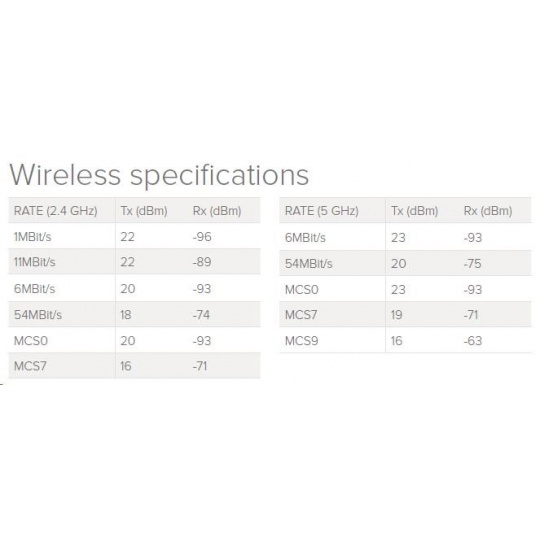 hAP ac lite je nový kompaktní router podporující standard 802.11ac. Je integrována jak 2.4GHz tak 5GHz Wi-Fi. (2.4GHz využívá 802.11b/g/b, dual chain 1.5dBi anténa, 300Mbps / 5GHz jede na 802.11ac a nechybí ani zpětná kompatibilita s 802.11a/n., single chain - 2dBi anténa, 433Mbps). Tato duální wifi tak dosahuje celkových přenosových rychlostí až 733Mbps. Procesor je taktován na 650MHz a sekunduje mu 64MB RAM operační paměti typu DDR. K dispozici je celkem pět ethernetových portů 100Mbps s podporou PoE in(port1) taktéž out (port5).