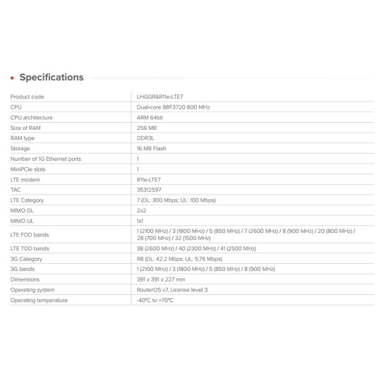 Extra výkonný venkovní aktivní prvek pro připojení k LTE na dlouhé vzdálenosti či odloučených lokalitách se slabým pokrytím signálem. LHGG LTE7 kit je navržena pro spolehlivý přístup k internetu „na poslední míli“ ve vzdálených lokalitách. Namontujte ji venku na sloup nebo stožár a připojte se i tam, kde mobilní telefony selhávají. Je vybavena směrovou anténou s vysokým ziskem 17dBi a modemem CAT7 LTE s rychlostí nahrávání až 100 Mbps, což zajišťuje vyšší výkon a lepší odezvu ve venkovských oblastech. Díky dvojnásobné kapacitě uplinku je vhodnější pro video dohled, VPN, práci na dálku a nasazení ve venkovských oblastech s více uživateli. Lehká mřížková konstrukce antény snižuje zatížení větrem a zároveň zachovává vysoký zisk. Lze ji montovat různými způsoby, včetně stožárů a sloupů. Odolný kryt a provozní teplotní rozsah od -40 °C do +70 °C zajišťují spolehlivý výkon v náročných klimatických podmínkách. Robustní chladič udržuje systém stabilní i při nepřetržitém zatížení. Hlavní funkce a vlastnosti: • VYSOKORYCHLOSTNÍ INTERNET I V ODLEHLÝCH LOKALITÁCH • RYCHLÝ MODEM CAT6 LTE • MODERNÍ DVOUJÁDROVÝ PROCESOR ARM • GIGABITOVÝ ETHERNET SE VSTUPEM POE-IN • PODPORA PÁSMA B28 • VELKÁ ANTÉNA S VYSOKÝM ZISKEM • MŘÍŽKOVÁ KONSTRUKCE ANTÉNY PRO NEJEXTRÉMNĚJŠÍ METEO PODMÍNKY RouterOS Mikrotik plně podporuje sítě IPv6 Technické specifikace: Product code: LHGGR&R11e-LTE7 CPU: Dual-core 88F3720 800 MHz CPU architecture: ARM 64bit Size of RAM 256 MB RAM type: DDR3L Storage: 16 MB Flash Number of 1G Ethernet ports: 1 MiniPCIe slots: 1 LTE modem: R11e-LTE7 TAC: 35312597 LTE Category: 7 (DL: 300 Mbps; UL: 100 Mbps) MIMO DL: 2x2 MIMO UL: 1x1 LTE FDD bands: 1 (2100 MHz) / 3 (1800 MHz) / 5 (850 MHz) / 7 (2600 MHz) / 8 (900 MHz) / 20 (800 MHz) / 28 (700 MHz) / 32 (1500 MHz) LTE TDD bands: 38 (2600 MHz) / 40 (2300 MHz) / 41 (2500 MHz) 3G Category: R8 (DL: 42.2 Mbps; UL: 5.76 Mbps) 3G bands: 1 (2100 MHz) / 3 (1800 MHz) / 5 (850 MHz) / 8 (900 MHz) Dimensions: 391 x 391 x 227 mm Operating system: RouterOS v7, License level 3 Operating temperature: -40°C to +70°C Napájení: DC input: PoE-In PoE-In input Voltage: 12-57 V Power adapter nominal voltage: 24 V Power adapter nominal current: 0.8 A PoE-in: 802.3af/at Max power consumption: 8 W.