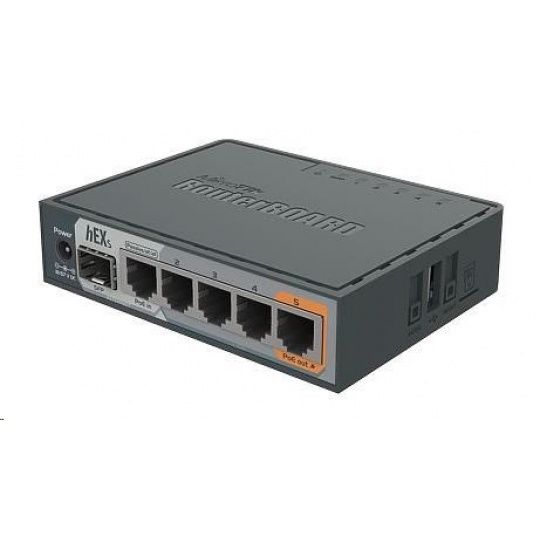 RB760iGS neboli hEX S je 5-portový Gigabitový router pro místa, kde není zapotřebí bezdrátové připojení. Ve srovnání s obyčejným hEX modelem má model hEX S také port SFP a výstupní PoE-Out na portu č.5.