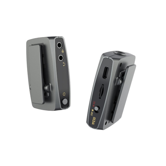 Vysílač v sadě WE10 je vybaven vysoce výkonným všesměrovým mikrofonem. K dispozici je i malý externí klopový mikrofon, který snadno připojíte k vysílači pomocí 3,5 mm jack konektoru a nabízí tak větší volnost při nahrávání. Na zadní straně vysílače je svorka, díky které jej můžete snadno připnout třeba na klopu, kapsu kalhot nebo opasek. Přijímač jednoduše upevníte na horní část fotoaparátu do kolébky blesku nebo připojíte na jiné zvolené záznamové zařízení (kamera, počítač, audio rekordér atd.). Vybrané zařízení propojíte pomocí 3,5 mm jack konektoru a přiloženého audio kabelu.