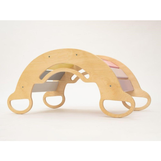 Montessori dětská houpačka smile 6in1 jistě vykouzlí úsměv na tváři vaší holčičky nebo chlapce. Svým designem, pastelovými barvami a širokým úsměvem bude denně lákat děti k zábavné hře i příjemnému pohoupání. Její využití je všestranné, může být houpačkou, skluzavkou, prolézačkou, skrýší i sedačkou, při doplnění oboustranným prknem i dětským nábytkem. Oboustranné prkno není součástí houpačky. Díky jemným pastelovým barvám je vhodná do každého interiér. Vyrobená je z těch nejkvalitnějších materiálů, ručně dohladka opracovaná a lakovaná barvami s atestem. Montessori houpačka smile je širší než naše Montessori houpačky 5in1, proto k této houpačce nabízíme i speciální oboustranné prkno, které je doplňkem k houpačkám smile. Díky prknu snadno proměníte houpačku smile v dětský stoleček. Oboustranné prkno není součástí houpačky, pro využití houpačky jako nábytku je nutné prkno samostatně dokoupit..