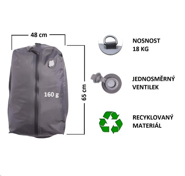 Do vaku Vacuo bag se toho vejde opravdu hodně. S rozměry 65 x 45 cm nabízí spoustu prostoru pro vaše věci. Během cestování vás díky své nízké hmotnosti 0,16 kg nijak nezatíží.