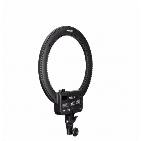 Stmívatelné dvoubarevné LED kruhové světlo Nanlite Halo 16 s napájením pomocí AC adaptéru nebo baterií Sony NP-F. Součástí balení je také držák na telefon, make-up zrcátko a přepravní pouzdro.