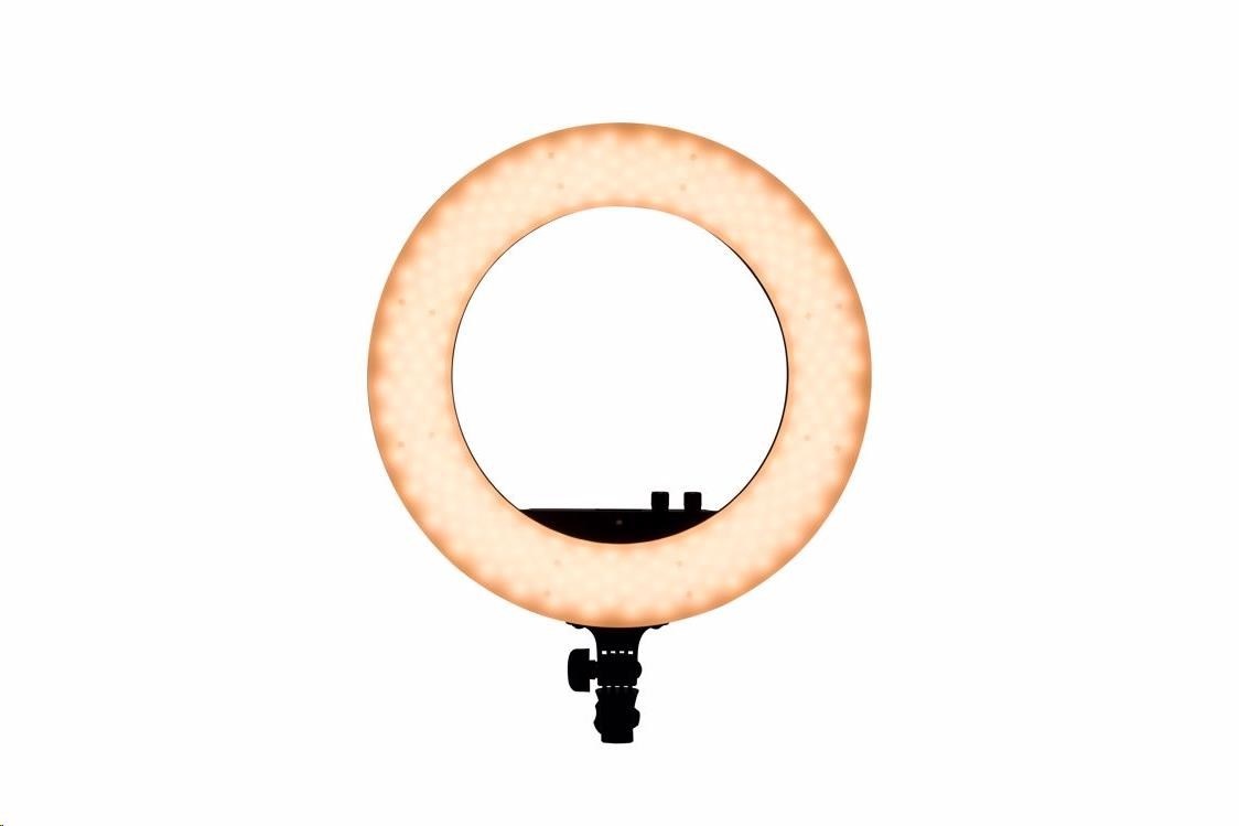 Stmívatelné dvoubarevné LED kruhové světlo Nanlite Halo 18 s napájením pomocí AC adaptéru. Součástí balení je také držák na telefon a oboustranné make-up zrcátko.