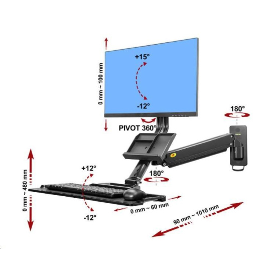 Kompletní specifikace Polohovatelná nástěnná pracovní stanice NB MB32 Profesionální držák na monitor 19" - 27" a klávesnici s myší, odkládací přihrádka, otáčení, náklon, výškové a délkové nastavení, VESA 75x75 a 100x100, nosnost 9kg, nejvyšší kvalita, systém vedení kabeláže, výškové polohování 480mm Profesionální držák na monitor a klávesnici, uchycení na svislou plochu (stěna, pilíř, sloup, stroje a zařízení). Polohování 3D - otáčení do stran, náklon monitoru, odsouvání a přisouvání ode zdi, výškové polohování (bez použití nářadí - dotykové), rotace monitoru (otočení na šířku nebo na výšku). Držák je vhodný pro zavěšení všech typů monitorů a All in One PC s úhlopříčkou 19" až 27" a hmotností 2-9kg. Police na klávesnici a myš s rozměry 560x200mm (možnost zaklopení) a přihrádka na dokumenty, vizitky, mobil a poznámky. Nejvyšší kvalita zpracování, snadná instalace a nastavitelnost. Systém skrytého vedení kabeláže. Barevné provedení černé. Držák na monitor nebo All in One Pc včetně poličky na klávesnici a myš, 3D polohování, profesionální, do kanceláře, výrobní haly, na stoje CNC a obráběcí, uchycení na svislou plochu nebo zeď - NB MB32 Technické údaje: nastavitelná nosnost dle hmotnosti monitoru 2kg až 9kg na monitory a All in One PC s úhlopříčkou 19" až 27" podpora VESA standardu 75x75 a 100x100 police na klávesnici a myš s rozměry 560mm x 200mm (možnost zaklopení, délková regulace 60mm) přihrádka na dokumenty, vizitky, poznánky, bločky, mobilní telefon otáčení do stran +/- 90° náklon obrazovky +12° / -12° výškové nastavení samotné obrazovky 100mm výškové polohování celého držáku 480mm rotace obrazovky PIVOT - natočení do vodorovné nebo svislé polohy vzdálenost od zdi 90mm až 1010mm plynová pružina pro výškové polohování bez použití nářadí (dotykové) systém pro vedení kabeláže materiál hliník, kryty plastové nejvyšší kvalita barevné provedení černé záruka 3 roky Držák All in One Pc nebo monitoru s poličkou na klávesnici a myš, uchycení na stěnu nebo svislou plochu, ideální do výroby, na stroje, CNC, obráběcí, do malých místností atd. - NB MB32 Držák na monitor NB MB32 podporuje VESA standardy: VESA 75x75 VESA 100x100 3D polohovatelný držák na monitor All in One Pc a klávesnici, uchycení na zeď nebo svislou plochu NB MB32 Nastavení výšky bez použití nářadí, snadno a rychle: Držák má integrovaný plynový píst, který po zavěšení monitoru otáčením imbusového klíče nastavíte na jeho hmotnost. Poté již bude držák zůstávat vždy v takové výšce, do které ho zatlačením na monitor nebo vytlačením dáte. Regulace výšky je možná v rozmezí 480mm. Ergonomická kancelář, držák monitoru a klávesnice s myší NB MB32 Kde lze držák monitoru nebo All in One PC s poličkou na klávesnici a myš použít: firmy, společnosti v kancelářích malé místnosti, práce bez stolu (možnost rychlého nastavení pro práci v sedě nebo vestoje) v dílnách v továrnách pozice na strojích (CNC, obráběcí atd.) ve skladech v domácnostech.
