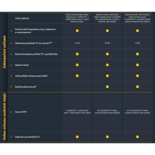 Elektronická licence Norton 360 Deluxe poskytuje komplexní ochranu před malwarem až pro 5 počítačů PC, počítačů Mac, zařízení se systémem Android nebo iOS, plus funkci rodičovské kontroly, která pomáhá chránit vaše děti online, správce hesel pro ukládání a správu hesel a funkci zálohování PC do cloudu. Norton 360 Deluxe zahrnuje také síť VPN pro 5 zařízení a aplikaci ochrana kamery před zneužitím pro počítače PC. Určeno pro nové uživatele i k obnově licencí stávajících uživatelů