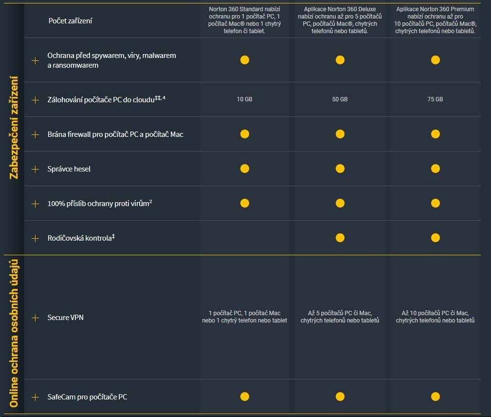 Elektronická licence Norton 360 Deluxe poskytuje komplexní ochranu před malwarem až pro 5 počítačů PC, počítačů Mac, zařízení se systémem Android nebo iOS, plus funkci rodičovské kontroly, která pomáhá chránit vaše děti online, správce hesel pro ukládání a správu hesel a funkci zálohování PC do cloudu. Norton 360 Deluxe zahrnuje také síť VPN pro 5 zařízení a aplikaci ochrana kamery před zneužitím pro počítače PC. Určeno pro nové uživatele i k obnově licencí stávajících uživatelů