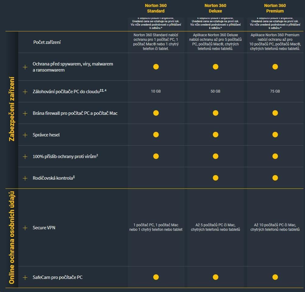 Norton 360 Standard poskytuje komplexní ochranu před malwarem pro jeden počítač PC, počítač Mac, zařízení se systémem Android nebo iOS a funkci zálohování do cloudu pro počítač PC, což pomáhá zabránit ztrátě dat kvůli ransomwaru nebo selhání pevného disku, a správce hesel pro ukládání a správu vašich hesel. Norton 360 Standard také obsahuje funkci ochrana sítě VPN, která vám umožňuje bezpečnější a anonymnější procházení webu, a to i ve veřejných sítích Wi-Fi a aplikaci ochrana kamery před zneužitím pro počítače PC.