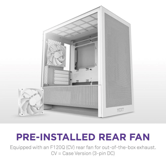 - Předinstalovaný zadní ventilátor: Obsahuje jeden zadní ventilátor F120Q (CV), který zajišťuje efektivní proudění výfukového vzduchu ihned po vybalení z krabice. CV = verze pro skříň (3-pin DC)