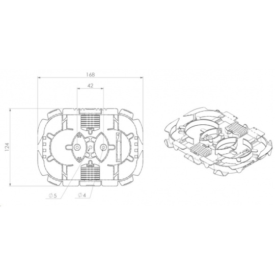 - dva hřebínky, pro celkovou kapacitu 24 ochran svárů. (Uchycení a konstrukční řešení výklopných hřebínků umožňuje vedení vláken i pod nimi)