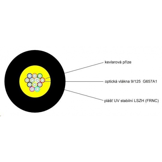 Optický singl mode 12 vláknový univerzální - černý (vnitřní/venkovní) samonosný kabel DROP FTTH v návinu 1000 m na cívce v samoodvíjecím boxu. Použitá jsou vlákna G.657A1.