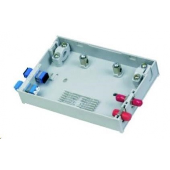 Malý plastový rozvaděč pro odbočkování z hlavního vedení. Umístění 6-ti svarků, 1x průchozí kabel hlavního vedení, 4 výstupní porty. Výstupní porty lze osadit simplex adaptéry pro ST, SC, FC a duplexním LC. Součástí je adaptér pro pigtail kabely (6 otvorů, 3mm průměr).