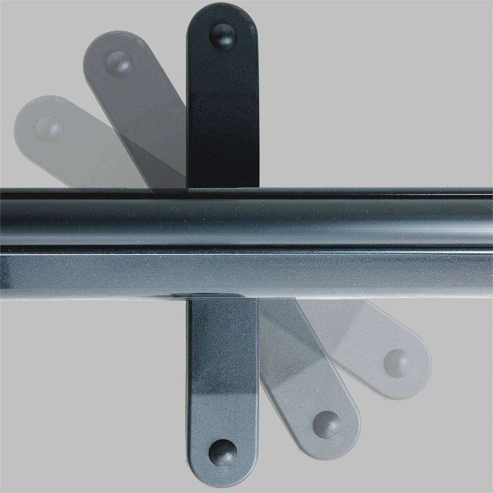 Inovativní design a bezpečnostní funkce, které bezpečně uzamknou obrazovku uvnitř pouzdra během přepravy. Po zvednutí opěrné tyče se pouzdro automaticky odemkne, což umožňuje vytažení obrazovky za rukojeť. Po zasunutí obrazovky se pouzdro automaticky uzamkne. Nosná tyč je také vybavena jednosměrným patentovaným zámkem, který umožňuje úplné zajištění a snadné nastavení opěrky zad. To vám umožní plynule upravit výšku obrazovky. Rukojeť neslouží pouze ke zvedání a vytahování zástěny z pouzdra, ale také k jejímu připevnění k nosné tyči, aby se zástěna nespadla nebo se posunula.