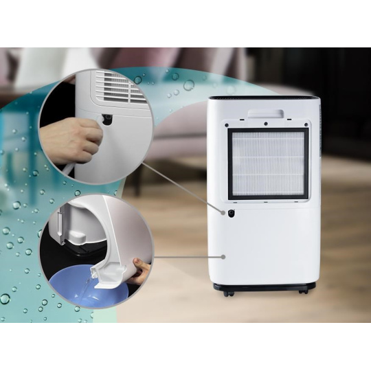 Vysokého výkonu dosahuje při pokojové teplotě 30 °C a 80% relativní vlhkosti, kdy ze vzduchu odsaje až 25 l za 24 hodin, při pokojové teplotě 27 °C a 60% relativní vlhkosti odsaje 12,4 l za 24 hodin. Objem zachycené nádoby na vodu je 4 l. Po naplnění této nádržky se odvlhčovač automaticky vypne. Nepřetržitý provoz je umožněn stálým odtokem vody pomocí hadice, která je součástí balení. Samozřejmostí je 12hodinový časovač, kde si můžete nastavit dobu provozu podle svých potřeb.