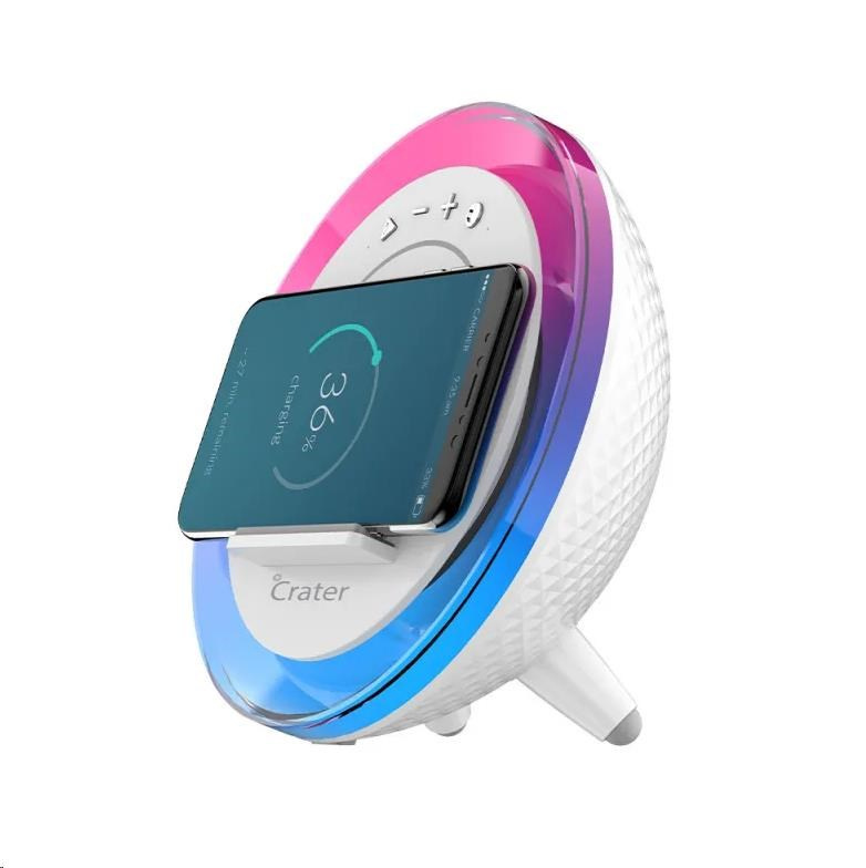 V neposlední řadě využijete Crater-9 také k dodání „šťávy“ pro váš smartphone. K nabíjení využívá bezdrátovou Qi technologii o výkonu 10 W, což je nejen pohodlné, rychlé, ale také šetrné. Vyhnete se hledání nabíjecího kabelu a jeho zbytečnému ohýbání a šetříte i nabíjecí porty mobilního telefonu. Smartfon stačí položit na vyznačenou plochu určenou k nabíjení, kde se vám mobil s podporou Qi technologie elegantně nabije třeba i při poslechu hudby nebo když už sladce spíte.