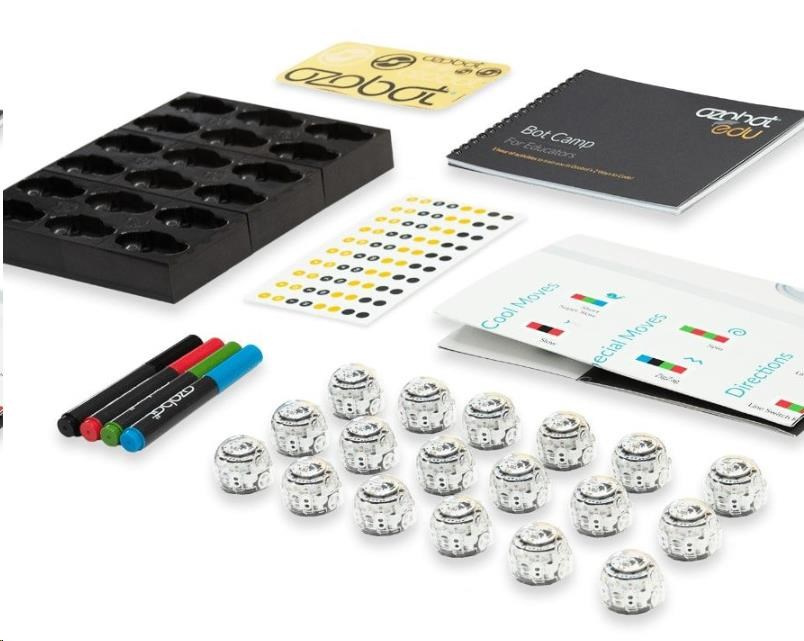Tato sada pro školy a zájmové kroužky je vybavená vším, co potřebují velké týmy, aby se do kódování mohly hned pustit. Vedle 18 Ozobotů Evo v ní najdete i soubor aktivit, které vám pomohou do tajů programování hladce proniknout. Nechybí ani set 18 omyvatelných fix, které dětem usnadní do kreslení barevných kódů a vlastních spletitých drah. Šířka stopy popisovačů je přizpůsobená přímo senzorům malého bota. Ten se tak lépe orientuje na jejich trasách a nevyžaduje tak častou kalibraci. Radost malým programátorům určitě udělá i množství barevných samolepek. Novinkou je pak nabíjecí matrice, která se postará i o automatickou aktualizaci softwaru. Má nízký profil a skromné rozměry, aby nikdy nepřekážela. Součástí balení je AC/DC adaptér pro zapojení nabíjecí stanice do standardní elektrické zásuvky.