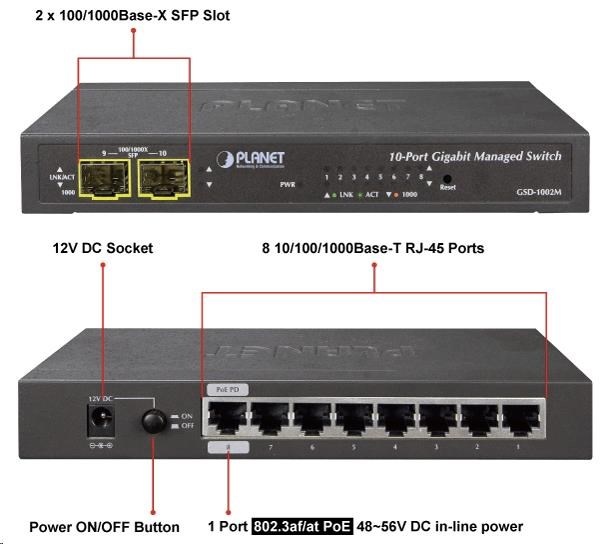 Planet GSD-1002M Switch, 8 x 10/100/1000 + 2 x 100/1000 Combo port, management, PoE-in napájení