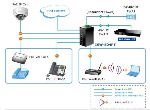 Planet ISW-504PT, 5x 10/100, 4x POE IEEE 802.3af, 60W, DIN, IP30, -40~75 st.C