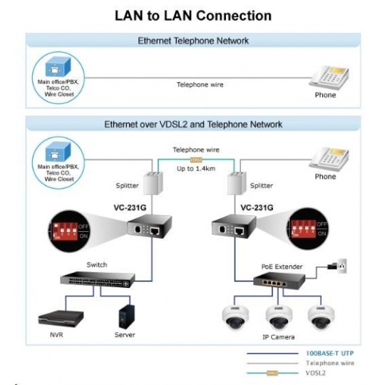 Planet VC-231G, Eth. VDSL2 konvertor, 1000Base-T, master/slave, profil 30a, G.993.5 Vectoring, G.INP, RJ-11
