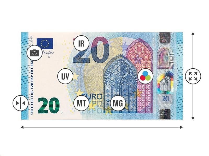 • 7-bodová detekce padělků: prvky viditelné v ultrafialovém světle, magnetický inkoust, kovový proužek, infračervené vlastnosti, obraz, velikost a tloušťka