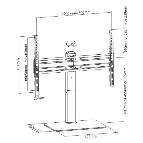 Podstava na televize Fiber FM05 Na televize 37-70", nastavitelná výška 405-735mm, otáčení do stran +/- 35°, skleněná podstava 420x280x8mm, VESA standardy 200x100 až 600x400, nosnost 40kg Kvalitní velmi pěkná podstava na televize s úhlopříčkou 37" až 70", která Vám umožní s televizí otáčet na obě strany až o 35°. Podstava má nastavitelnou výšku v 6 pozicích - 3 pozice na nosníku a 3 pozice na ramenech držáku od 405mm do 735mm. Podporuje velikosti VESA standardů od 200x100 do 600x400, Dolní police je z tvrzeného skla o síle 8mm a rozměry 420x280mm. Barevné provedení černé, balení obsahuje instalační sadu. Záruka 5 let. Tv podstavec s otáčením do stran a nastavením výšky Fiber FM05 Technické údaje: nosnost 40kg na televize s úhlopříčkou 37" až 70" podporuje VESA standardy 200x100 až 600x400 nastavitelná výška 405, 455, 505, 645, 690 a 735mm otáčení televize na obě strany +/- 35° úchytky na kabeláž podstava z tvrzeného skla s rozměry 420x280x8mm designové provedení vynikající kvalita barevné provedení černé záruka 5 let Kvalitní dizajnový podstavec na televize Fiber FM05 Držák na podstavě Fiber FM05 podporuje VESA standardy: VESA 200x100 VESA 200x200 VESA 300x200 a 200x300 VESA 300x300 VESA 400x200 a 200x400 VESA 400x300 a 300x400 VESA 400x400 VESA 600x400.