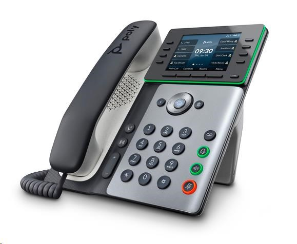 | Audio | Poly HD Voice; Technologie Poly Acoustic Clarity zajišťuje plně duplexní hovory a potlačuje akustickou ozvěnu i okolní šum; Technologie Poly Acoustic Fence potlačuje okolní hluk při použití sluchátka nebo kabelové náhlavní soupravy; Technologie Poly NoiseBlockAI odstraňuje většinu okolního hluku při používání konferenčního reproduktoru; Aplikace Poly Computer Audio Connector nainstalovaná v počítači (pouze Windows) umožňuje vybrat telefon pro zvukový vstup a výstup počítače a použít s počítačovými aplikacemi sluchátka, volitelné náhlavní soupravy a handsfree hlasitého odposlechu; Širokopásmový zvuk TIA-920, v souladu s typem 1 (plně duplexní IEEE 1329); Individuální nastavení hlasitosti s vizuální zpětnou vazbou pro každou zvukovou cestu; Detekce hlasové aktivity; Komfortní tvorba hluku; Generování tónů DTMF (RFC 2833 a v pásmu); Přenos zvukových paketů s nízkým zpožděním; Adaptivní paměti pro vyrovnání zpoždění |