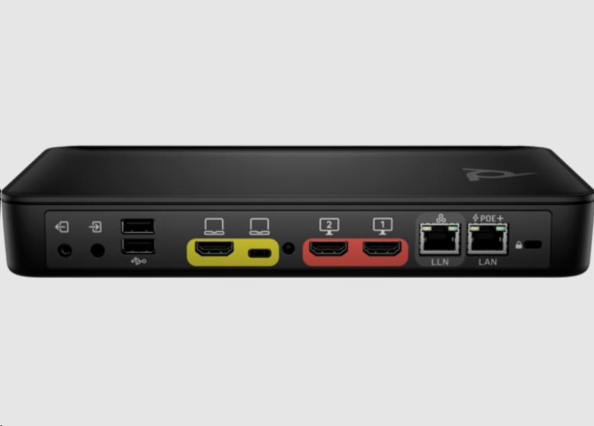 | Porty | 2× USB Type-A s přenosovou rychlostí 5 Gb/s; 1× vstup HDMI 2.0; 1× linkový vstup; 1× linkový výstup; 2× výstup HDMI 2.0 (video); 1× PoE+ 802.3at třídy 4 LAN RJ-45; 1× LLN RJ-45; 1× USB Type-C® s přenosovou rychlostí 5 Gb/s (s rozhraním DisplayPort™ Alt Mode pro vstup videa, 2 pásma 4K při 30 Hz) |