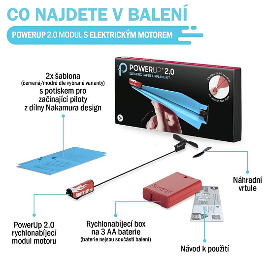 Uvnitř balení na vás čeká jedna pohonná jednotka PowerUp 2.0 doplněná o dvě papírové šablony, náhradní vrtuli, přenosný rychlonabíjecí box a podrobnou uživatelskou příručku. Je tak ideálním dárkem pro zvídavé letce.