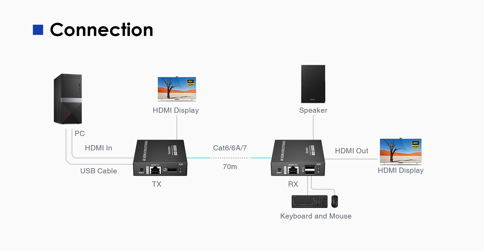 Umožňuje distribuovat HDMI signál o vysokém rozlišení 4K@60Hz bez zpoždění až na 70 metrů a přenášet zároveň USB (například klávesnici, myš nebo jiné USB periferie)