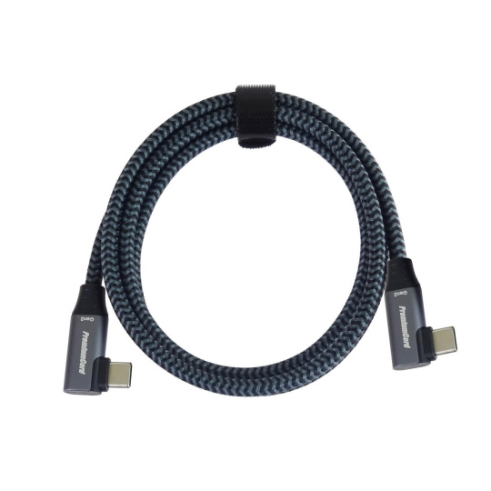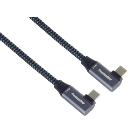 PremiumCord USB-C 2x zahnutý 90° kabel ( USB 3.2 GEN 2x2, 5A, 100W, 20Gbit/s ) hliníkové krytky konektorů, bavlněný oplet, 1m