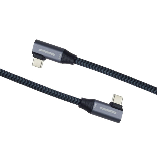 PremiumCord USB-C 2x zahnutý 90° kabel ( USB 3.2 GEN 2x2, 5A, 100W, 20Gbit/s ) hliníkové krytky konektorů, bavlněný oplet, 3m