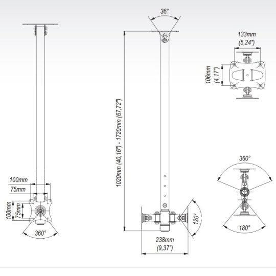 EDBAK SV35 stropní držák na 2 monitory Profesionální stropní držák na 2 obrazovky 17-43", výškové nastavení, otáčení, náklon Špičkový stropní držák pro zavěšení 2 televizorů nebo monitorů. Držák umožňuje délkové nastavení, nezávislé otáčení jednotlivých obrazovek a jejich naklonění. Profesionální konstrukce. Dodáváme v černém nebo stříbrném provedení. Záruka 5 let. Profesionální stropní držák na 2 obrazovky, nastavení délky, otáčení, náklon - EDBAK SV35 Technické údaje: max. zatížení 30kg podporuje VESA standardy 75x75 a 100x100 možnost rozšíření VESA na 200x100 nebo 200x200 vhodné na monitory a Tv 17" až 43" minimální délka držáku 1020mm maximální délka držáku 1720mm nastavení délky dle potřeby v uvedeném rozmezí nezávislé otáčení každého monitoru v rozmezí +90° / -90° nezávislé naklonění každého monitoru v rozmezí +60° / -60° možnost uchycení držáku na svislé stropní konstrukce 0° až 18° korekce roviny obrazovek horizontální i vertikální otočení obrazovek - funkce PIVOT bezpečné zavěšení 2 obrazovek profesionální konstrukce barva černá nebo stříbrná záruka 5 let Stropní držák na 2 obrazovky EDBAK SV35 podporuje VESA standardy: VESA 75x75 VESA 100x100 VESA 200x100 za příplatek VESA 200x200 za příplatek.
