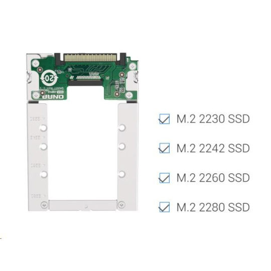 Lehký QDA-UMP4A umožňuje nainstalovat M.2 PCIe NVMe SSD do 2,5” slotu pro U.2 (SFF-8639) PCIe NVMe SSD zařízení QNAP NAS. (M.2 SSD se prodává samostatně)