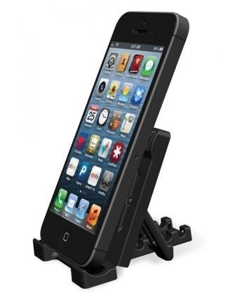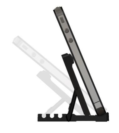 Stojánek pro chytré dotykové telefony v horizontální i vertikální poloze na stůl. Možnost nastavení 5 úhlů, skládací mechanizmus pro snadný transport, opření telefonu na spodní hraně, plastové provedení, černý..