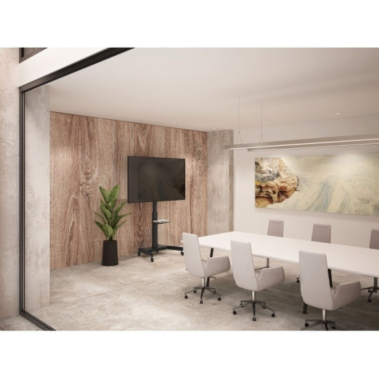 Televizní stolek na velké TV s uhlopříčkou 32"- 65" (81-165cm) a hmotností maximálně 35kg. Středový nosný profil 120-160cm na kolečkách s aretací, držák vertikálně výklopný +0°/-10°, police 33x43cm max 5kg, Cable managment, rozměry 87x63x142cm, materiál alu/ocel, barva černá. Uchycení VESA: 200x200, 300x200, 300x300, 400x200, 400x400, 600x400..