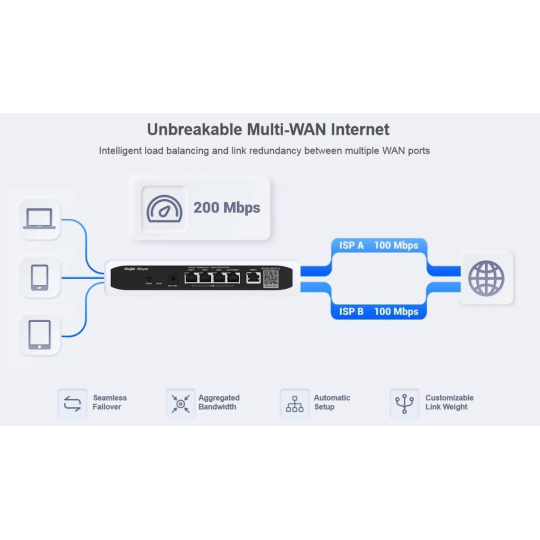Registrace dealerské ceny: https://docs.google.com/forms/d/1sWwsswsbBk36eZx4CJrfl47qUvrORQyYz7kMjrt2f_c/prefill Popis produktu Ruijie RG-EG105G V2 je kabelový Gigabitový router s VPN vhodný do domácností i malých firem. Bezpečný a spolehlivý router s vlastním webovým managementem, možností správy přes Ruijie Cloud odkudkoliv a kdykoliv ale také blokováním obsahu na základě typu služeb z automaticky updatovaného seznamu nebo URL, inteligentní Multi-WAN load balancing a captive portál. Router disponuje 2 Gigabitovými WAN porty z čehož jeden je LAN/WAN, 3 Gigabitovými LAN porty a celkovým výkonem v NATu 600 Mbps. Router pro přístup do lokální sítě umožňuje nastavení i několika možností VPN serverů a to konkrétně: IPsec, PPTP, L2TP a OpenVPN. Obsah balení • Zařízení • Napájecí adaptér 12V Technické parametry Konektory a rozhraní Možnost více WAN:Ano Rychlost LAN:(3) 10/100/1000Mbps + (1) 10/100/1000Mbps LAN/WAN Gigabit LAN:Ano Napájení Typ napájení:DC konektor Max. spotřeba energie [W]:6 Napájení přes konektor/svorkovnici:12V DC Fyzické charakteristiky Provedení:Desktop Ventilátory:Bez ventilátoru Šasi:Kovové Tlačítka:Reset Provozní teplota [°C]:0 až 40 Šířka [mm]:207 Výška [mm]:28 Hloubka [mm]:109 Hardware CPU:Dual Core Frekvence CPU [MHz]:880 Počet CPU jader:2 RAM [MB]:128 Obecné Propustnost NAT [Mb/s]:600 Software Podporované VPN:PPTP, L2TP, IPSec, OpenVPN.