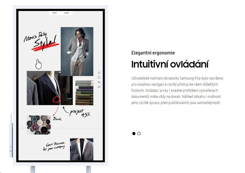 Uživatelské rozhraní obrazovky Samsung Flip bylo navrženo pro snadnou navigaci a rychlý přístup ke všem důležitým funkcím. Ovládací prvky i snadné prohlížení vytvořených dokumentů máte vždy na dosah. Náhled obsahu i možnost jeho rychlé úpravy před publikováním jsou samozřejmostí.