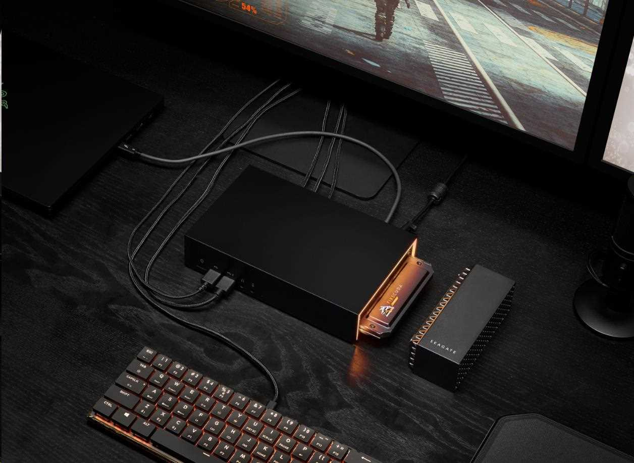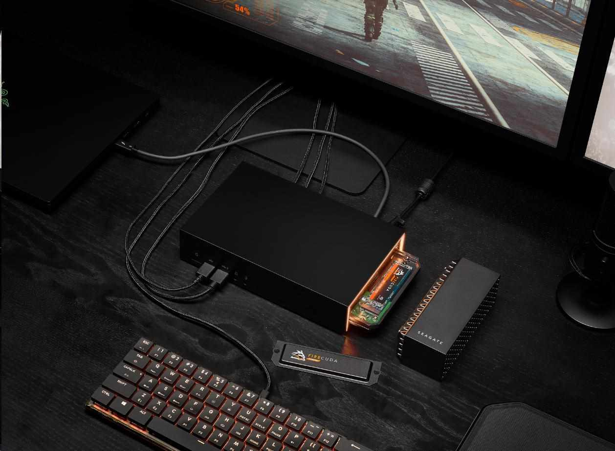 Hrajte tvrději s Seagate® FireCuda® Gaming Dock, elitním 4TB úložným hubem, který propojuje celou stolní bitevní stanici – klávesnici, myš, USB sluchátka, webovou kameru, monitor displeje a další – prostřednictvím jednoho kabelu Thunderbolt 3. Zapojte jej do notebooku a použijte rozšiřitelný slot M.2 NVMe pro práci s upgradem FireCuda 510 NVMe SSD pro přeplňované spouštění aplikací a doby načítání. Je dokonce vybaven přizpůsobitelnými RGB LED světly pro rovnoměrné osvětlení.