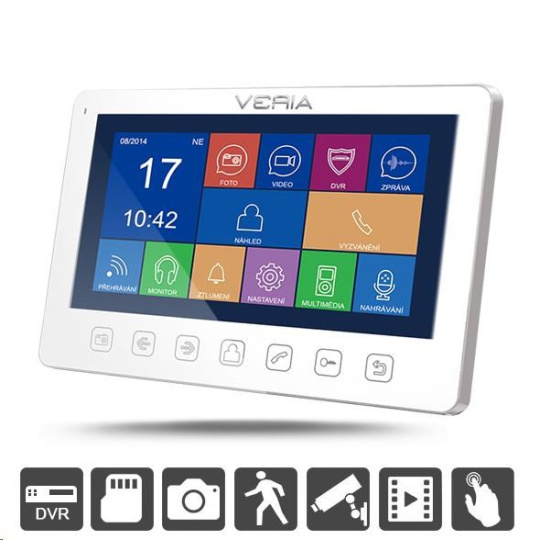 VERIA 7076 nabízí svému uživateli komfortní kombinací videotelefonu a jednoduchého DVR monitorovacího systému s možností zachycení snímku nebo video záznamu využívající tak sofistikované funkce jako je například detekce pohybu nebo podpora připojení externích CCTV kamer pro sledování okolí.
