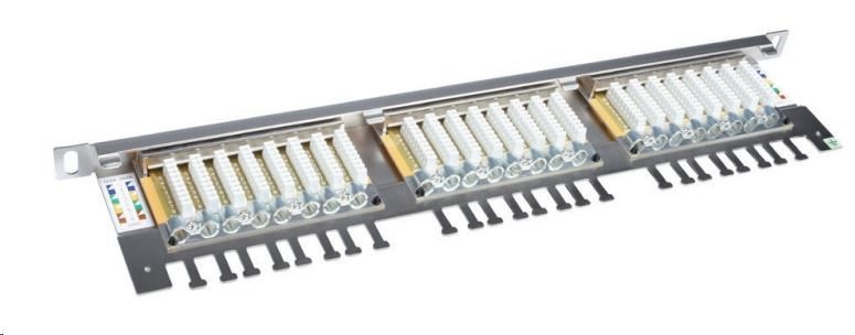 High-density 0,5U stíněný patch panel CAT6 24 portů s vyvazovací lištou.
