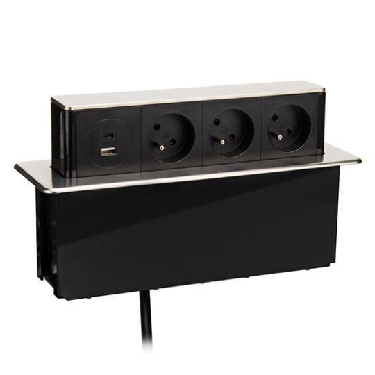Výsuvný blok se zásuvkami pro pracovní desky a stoly, elegantně schované, vysunou se pouze v případě potřeby a nezabírají zbytečně místo, vrchní kryt z nerez oceli, 3 zásuvky 230V~ / 16A, max. 3680W, dětské pojistky, USB fast charge nabíječka QC 3.0.... více