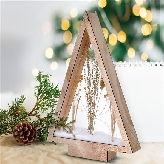 Přírodní, vánoční dřevěná dekorace ve tvaru vánočního stromku se zasněženými zimními květinami, podsvícené tenkým LED řetízkem