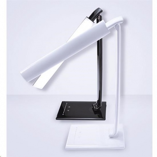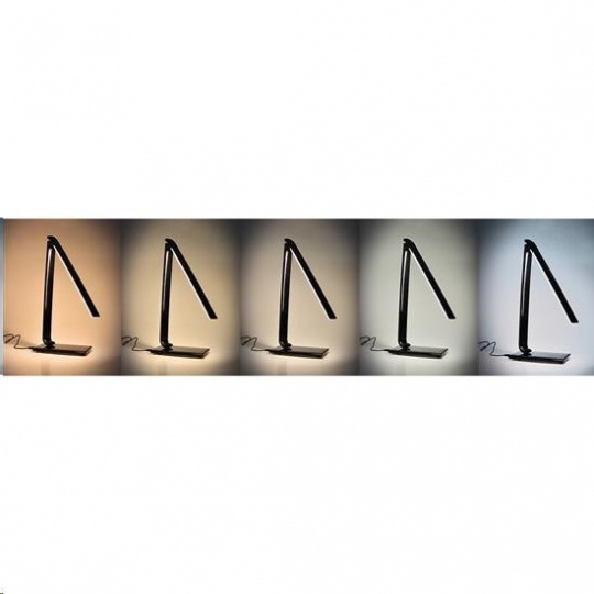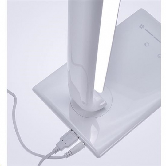 stolní lampička s LED světelným zdrojem možnost volby 5 barev světla – teplá, neutrální bílá, bílá a studená bílá (3000K-6000K) stmívatelná - plynulá regulace jasu dotykové spínání maximálně flexibilní - ohebné rameno, otočná základna a náklopná hlava příkon: max. 12W světelný tok: max. 700lm USB napájecí zdířka pro nabíjení telefonů (5V, 1000mA) USB kábel súčasťou protiskluzová základna s dotykovým vypínačem barva: bílý lesk napájení: AC 100-240V délka napájecího kabelu: 140cm rozměry: cca 420 x 360 x 125mm energetická třída: A+ LED zdroj nelze měnit materiál: ABS.