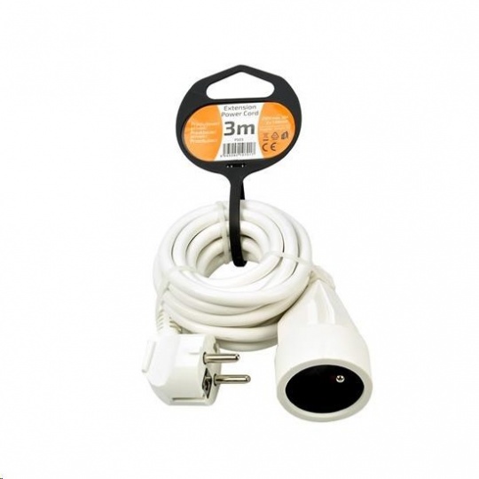 Kompaktní bílý prodlužovací kabel s délkou 3 metry a jednou zásuvkou je ideální pro jednoduché prodloužení elektrické energie v domácnosti, kanceláři nebo dílně. Vhodný pro připojení samostatného zařízení mimo dosah pevné zásuvky.