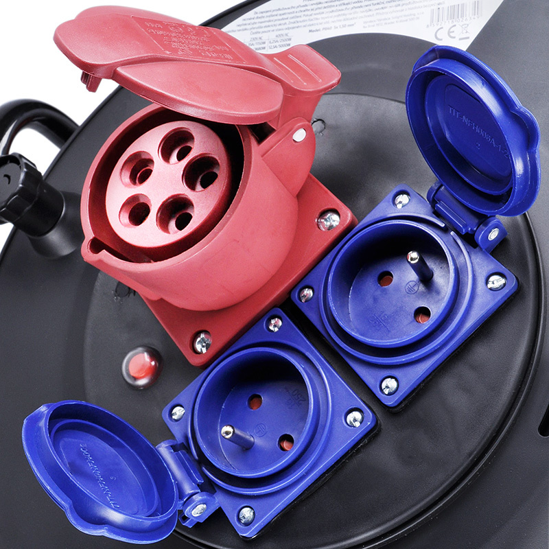 Přívod kombinuje jednu zásuvku na 400 V a dvě klasické zásuvky 230 V, což umožňuje napájet silové i běžné spotřebiče z jednoho místa. Svářečky, kotoučové pily, míchačky, kompresory, atd. Skvělý pomocník na stavbách, v dílnách i v náročných provozech.