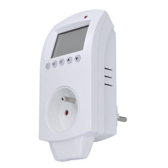 termostaticky spínaná programovatelná zásuvka pro vnitřní použití, spíná při dosažení nastavené teploty možnost nastavení různých režimu pro vytápění nebo chlazení (až 6 režimů pro 24h) možnost nastavení pro všední den a víkend časový spínač, umožňuje zásuvku zapnout nebo vypnout automatický režim/režim ručního nastavení přesnost měření teploty ±1°C rozsah nastavení teplot 5°C až 35°C vlastní spotřeba 0,3W krytí IP20 napájení: 230V/50Hz, max. zatížení 16A, 3680W.