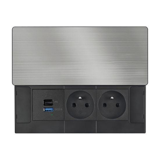 Vrchní kryt z matné tmavé nerez oceli (inox) působí elegantně a přirozeně zapadne do moderního interiéru. Nízký profil, čisté linie a nenápadné posuvné otevírání zachovávají vzhled pracovní plochy. Zásuvky i nabíjecí porty jsou kdykoli snadno přístupné jednoduchým pohybem ruky.