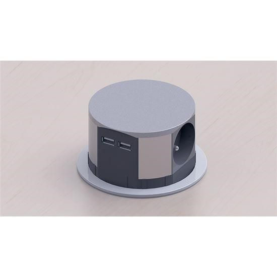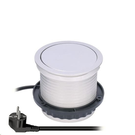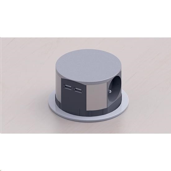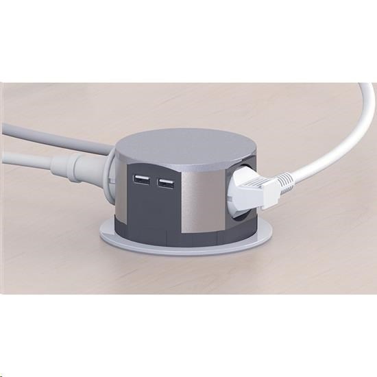Solight výsuvný blok zásuvek, 3 zásuvky, 2x USB, kruhový tvar nízký, prodlužovací přívod 1,5m, 3 x 1mm2, stříbrný